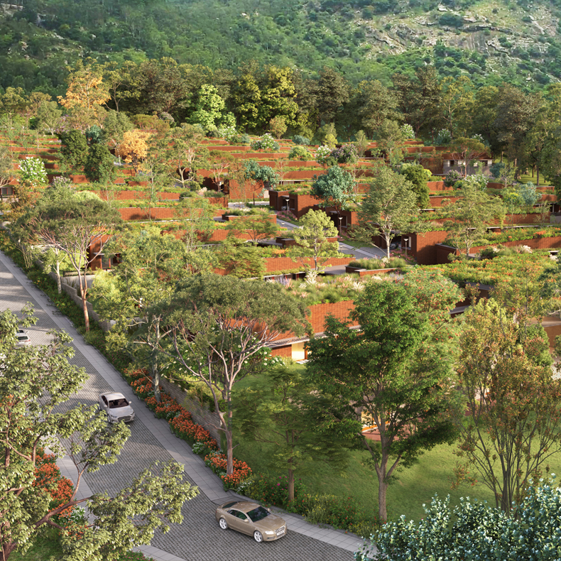 Over the Rainbow is located at the foothills of the scenic Nandi Hills in Bengaluru. These single storied earth-sheltered villa homes with 2 gardens and earthy exterior finishes, are set along the existing hilly terrain in a stepped form to blend into the natural landscape. The stepped arrangement maximises light and ventilation while facilitating uninterrupted views.
